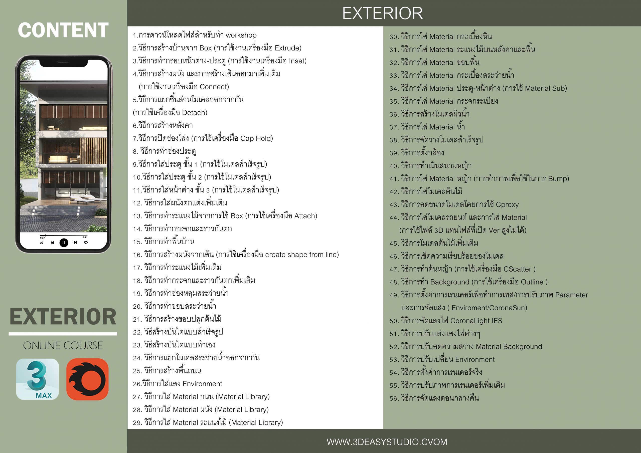 EXTERIOR author Admin-3Deasystudio Category 3Ds Max Corona (0 reviews) Course Description ขึ้นโมเดลบ้านแบบง่ายๆ จากการใช้ BOX ทำยังไง? ปลูกหญ้า สร้างเนิน ใส่ต้นไม้ ทำสระว่ายน้ำ รวมถึงการจัดแสงภายนอกทั้งกลางวันและกลางคืน และลดความหนักของ Model ด้วยเครื่องมือ….? ติดต่อสมัครเรียนผ่าน Facebook คลิก ! ติดต่อสมัครเรียนผ่าน LINE คลิก ! เนื้อหาการสอน Curriculums EXTERIOR Please login to bookmark this course. Bookmark This Course About Instructor Admin-3Deasystudio 3DS Max Professional View Profile 1,990 ฿Take this course Price: 1,990 ฿Take this course Students: 98 Lessons: 1 Prerequisites: No Skill Level: advanced Certificate: No